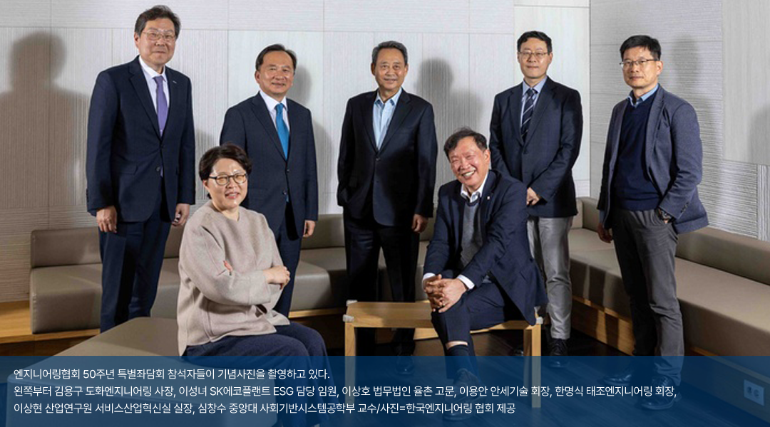 ◆참석자<산업계> 김용구 ㈜도화엔지니어링 사장, 이용안 ㈜안세기술 회장, 이성녀 SK에코플랜트 ESG 담당 임원, 한명식 ㈜태조엔지니어링 회장 <학계> 심창수 중앙대학교 사회기반시스템공학부 교수 <연구계> 이상현 산업연구원 서비스산업혁신실 실장, 이상호 (유)법무법인율촌 고문