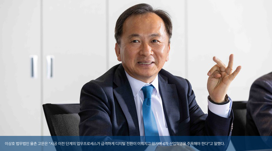 <이상호 고문 / 법무법인율촌> 요즘 4차 산업이라는 단어를 많이 쓰는 것 같은데, 저는 이 단어를 인류가 맞이한 네 번째 생산성 혁명의 시기라는 의미를 담아 ‘4차 산업혁명’이라고 불러야 한다고 생각합니다. 기본적으로 4차 산업혁명은 디지털 기술에 기반한 가상세계와 현실세계의 융복합 시스템을 활용한 생산성 혁신의 시대라고 정의하는데요. 우리가 4차 산업혁명을 주목해 봐야 하는 이유는 엔지니어링산업과 매우 밀접한 관계가 있기 때문입니다. 예를 들어 건설 분야를 보면 시공 이전, 즉 프리 컨스트럭션(pre-construction) 단계의 업무 프로세스가 급격하게 디지털 전환이 이루어지고 있고, 이런 기술적 발전은 가상 시뮬레이션을 통해 건설 프로세스를 미리 체험해보고 수정할 수 있는 디지털 트윈(digital twin)과 같은 기술의 보편화로 이어지고 있습니다. 가령 플랜트 공장을 짓는다고 하면, 가상세계에서 먼저 똑같이 지어보고 시뮬레이션하면서 문제점을 파악해 실제 시공에 반영하는 것이지요. 이런 기술들이 앞으로 더욱 보편화된다면 실제 생산성 향상에 큰 영향을 미칠 것으로 보여집니다.