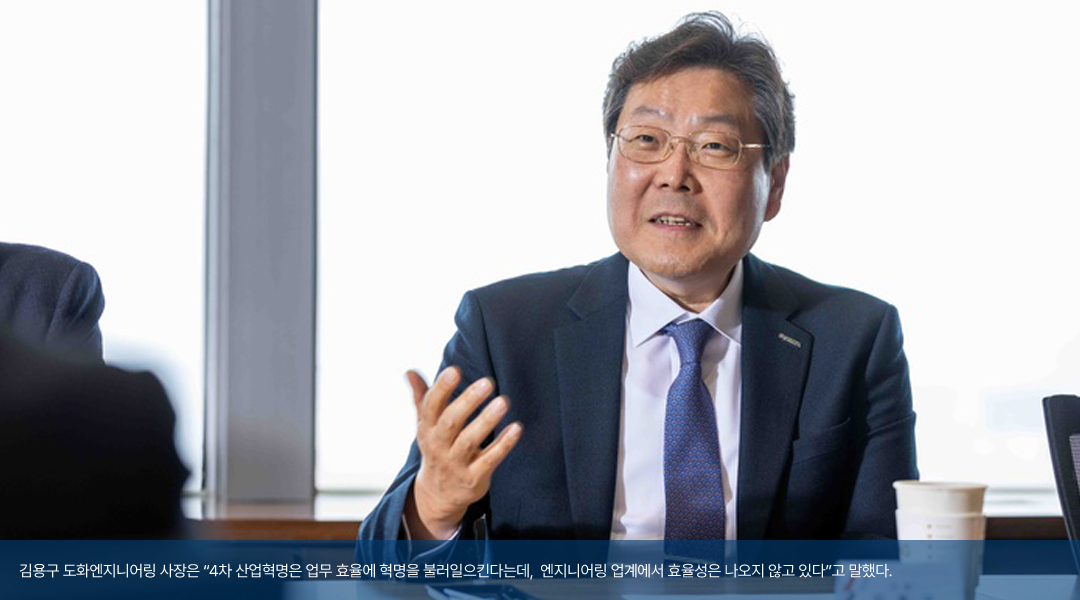 <김용구 사장 / 도화엔지니어링> 저희도 2018년부터 본격적으로 업무를 디지털화하면서 데이터를 모으고 있습니다. 현재는 다행히 데이터를 활용할 수 있는 단계에 접어들었지만, 6년 동안은 생산성이 오히려 떨어졌어요. 지금까지 모은 데이터가 약 30 테라바이트 정도의 상당히 방대한 양인데, 아직 그 데이터를 적극적으로 활용하기는 쉽지 않습니다. 그렇게 되면 데이터의 가치는 떨어지게 되거든요. 요즘에는 이 데이터를 어떻게 효과적으로 잘 활용 할 수 있을지 심도 있게 고민하고 있습니다. 그리고 BIM이 화두가 되면서 저희도 직원 교육도 시키고 적극적으로 현업에 적용하려고 하고 있지만, 비용 대비 그 이상의 생산성이 나와야 하는데 실상은 그렇지 못 할 때가 많습니다. 토목 설계는 비정형의 지반 정보에 사업 면적도 매우 크기 때문에 BIM 기술을 적용하는 것은 매우 복잡해 시간과 노력이 매우 많이 듭니다. 그렇게 BIM 기술을 통해 설계도를 그리면 그 안에는 시공과 운영에 필요한 정보까지 모두 담긴 결과물이 나오게 됩니다. 결국 BIM이 점차 의무화가 되면 궁극적으로 혜택을 보는 곳은 시공업체와 운영업체에요. 4차 산업혁명은 곧 업무 효율에 혁명을 불러일으켰다고 보고 있는데, 아직 우리 업계에서 효율성은 별로 나오지 않고 있다고 생각합니다.