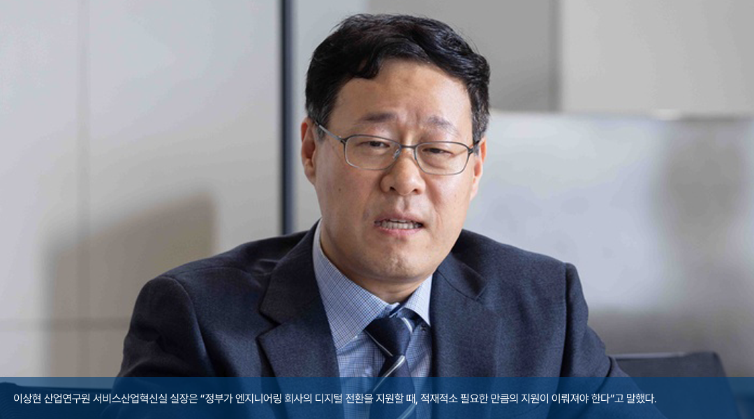<이상현 실장 / 산업연구원 서비스산업혁신실> 저는 공학이 아니라 경제학을 베이스로 엔지니어링 분야를 연구하는 사람으로서, 정부가 엔지니어링 정책을 수립할 때 방향을 모색하고 정당성을 확보하기 위한 근거나 최신 동향 등에 대한 자문을 하고 있습니다. 그런데 디지털 전환을 바라보는 기업의 관점과 정부 정책의 관점에는 차이가 있는 것 같아요. 기업은 투자를 한다면 반드시 성과가 수반되어야 하잖아요. 투자수익률(ROI)이 나오지 않으면 사실 투자할 이유가 없으니까요. 반면 정부는 일단 기업들이 새로운 흐름에 뒤처지지 않으면서, 기업 간 디지털 격차가 크게 벌어지지 않도록 투자와 참여를 유도하는 방향으로 정책을 수립할 수밖에 없습니다. 가장 큰 문제는 디지털 격차 부분입니다. 서플라이체인(supply chain)이든 밸류체인(value chain)이든 각 기업마다 디지털 전환에 대한 역량의 상한이 분명 다 있을 테고, 모두에게 동일한 수준의 디지털 전환을 요구할 수는 없어요. 그런 부분을 정책 차원에서 명확히 식별해서 과잉 지원이 아니라 적재적소 필요한 만큼의 지원이 이루어 질 수 있도록 고민해야 합니다.