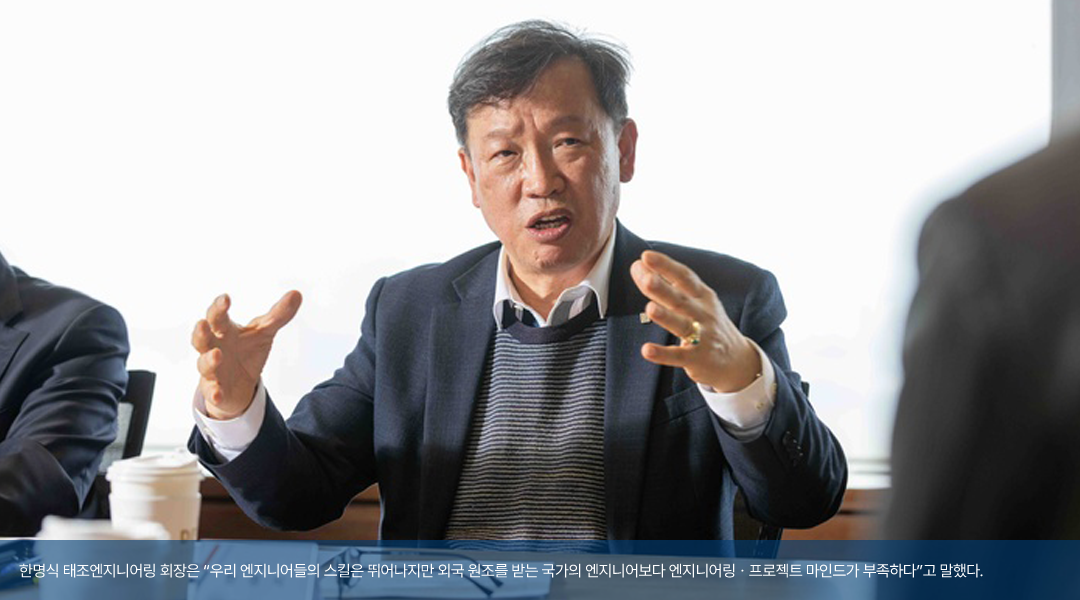 <한명식 회장 / 태조엔지니어링> 맞습니다. 우리 엔지니어들은 엔지니어링 스킬은 누구보다도 뛰어나요. 그런데 외국의 원조를 받는 나라의 엔지니어보다 못한 부분이 엔지니어링 마인드나 프로젝트 마인드가 너무 부족합니다. 국내 프로젝트를 수행하는 데는 문제가 없지만, 글로벌 시장에서는 엔지니어링 마인드나 프로젝트 마인드가 없으면 한 발자국도 못 나갑니다. 이 문제를 극복하지 않으면 우리 엔지니어링은 희망이 없어요. 우리 엔지니어링을 둘러싼 환경과 문화를 통째로 바꾸지 않으면 성과를 거두지 어렵다는 뜻입니다.