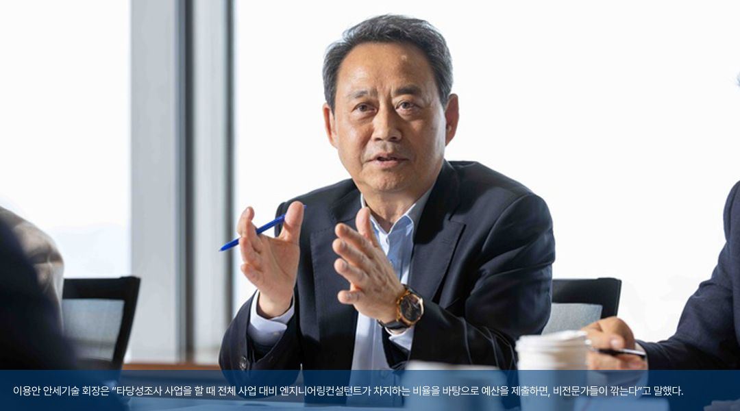 <이용안 회장 / 안세기술> 맞습니다. 타당성조사 사업을 할 때 저희가 전체사업 대비 엔지니어링컨설턴트가 차지하는 비율을 바탕으로 예산을 제출하면, 비전문가들이 앉아서 무조건 깎아요. 엔지니어링컨설팅이 얼마나 중요한 역할을 하는지 관심도 없고, 일단 비용부터 깎고 시작하니까 저희로서는 하고 싶어도 수준 높은 업무를 수행하는 데 한계가 있어요.