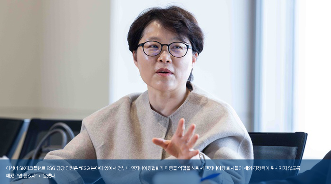 <이성녀 임원 / SK에코플랜트 ESG 담당> 해외 시장 진출과 관련해서는 제가 여기 오기 전에 저희 부서 팀장 다섯 명을 만나 협회에 전달하고 싶은 애로사항에 대해 조사해 봤어요. 글로벌 시장에 나가 현지 사업주들하고 계약을 체결할 때 역량이 부족하다는 걸 많이 느낀다는 겁니다. 이런 부분에 도움을 줄 수 있는 해외 시장의 전문가를 만날 수 있는 자리를 협회가 주관해주면 좋을 것 같습니다.
